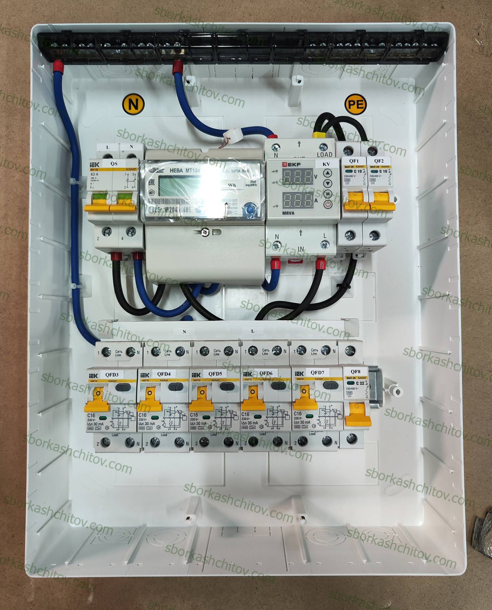Электрощит 63А 220В для 2 комнатной квартиры на 8 отходящих групп SS-IEK220-MEDIUM-1F-2K-M1412