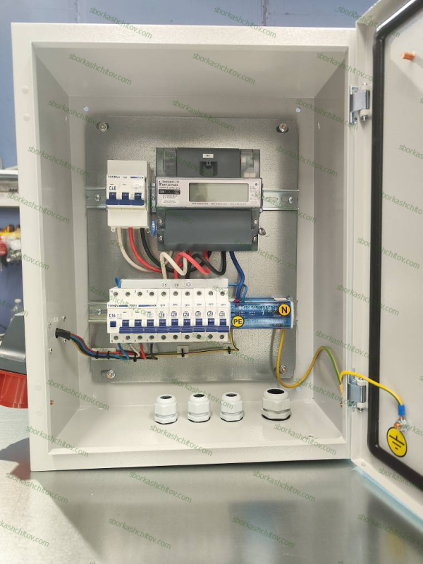 Щит учета электроэнергии 25 кВт 40А 380в IP54 трехфазный, с 6 отходящими автоматами и накладной розеткой 5п 16А SS-31250